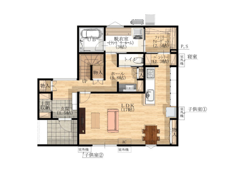 土間収納・パントリー・ファミクロなど、使いやすい場所に収納をしっかり確保。回遊できる間取りと洗濯動線で、毎日の暮らしを快適にサポートします。